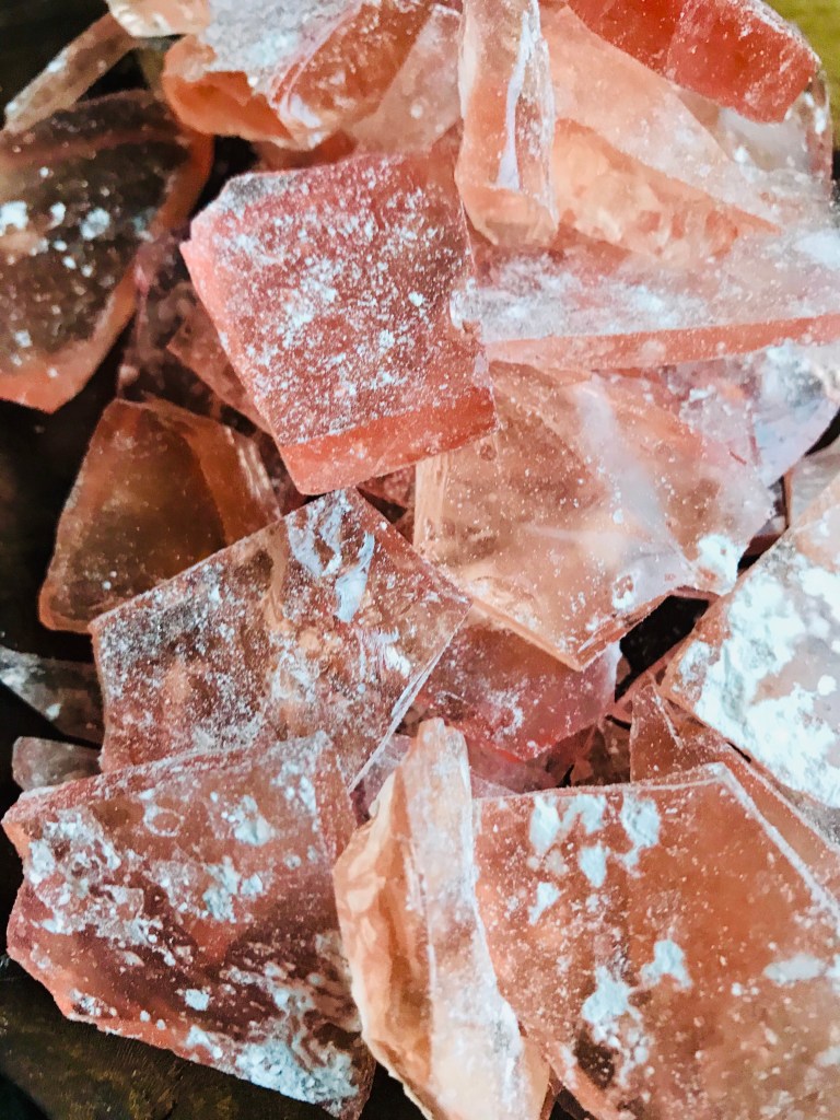 One of the things I love about this recipe is the strong link to my childhood home it stirs up when I make it-the way it can pull me back to the valley-draw me back to that house with the metal roof, cedar posts on the porch, and country blue front door. I loved making this recipe with my mom around Christmas time as a gift we would give to friends and the few neighbors we had. My role was the assistant to steps 4 and 7. I still remember the sense of urgency (and importance) I felt grabbing the hot pads and spoon and running ahead of my mom to open the door for her to go outside onto the deck. We’d always pour the cinnamon oil into the pan on the corner of the deck, under the winter-bare branches of the wild cherry tree, and I’d wave the pot holders, frantically trying to fan the fumes away from us while looking out at the pond. The coughing brought on by inadvertent fume inhalation is still a vivid memory as well-but even that is a fond one. But my favorite job (aside from the eating) was cracking the red and green candy once it had hardened with the heavy end of the butter knife. Hearing that THWACK! and seeing the candy crack and “run” like breaking glass before we’d put the pieces into pint or half pint jars to gift was fun.
